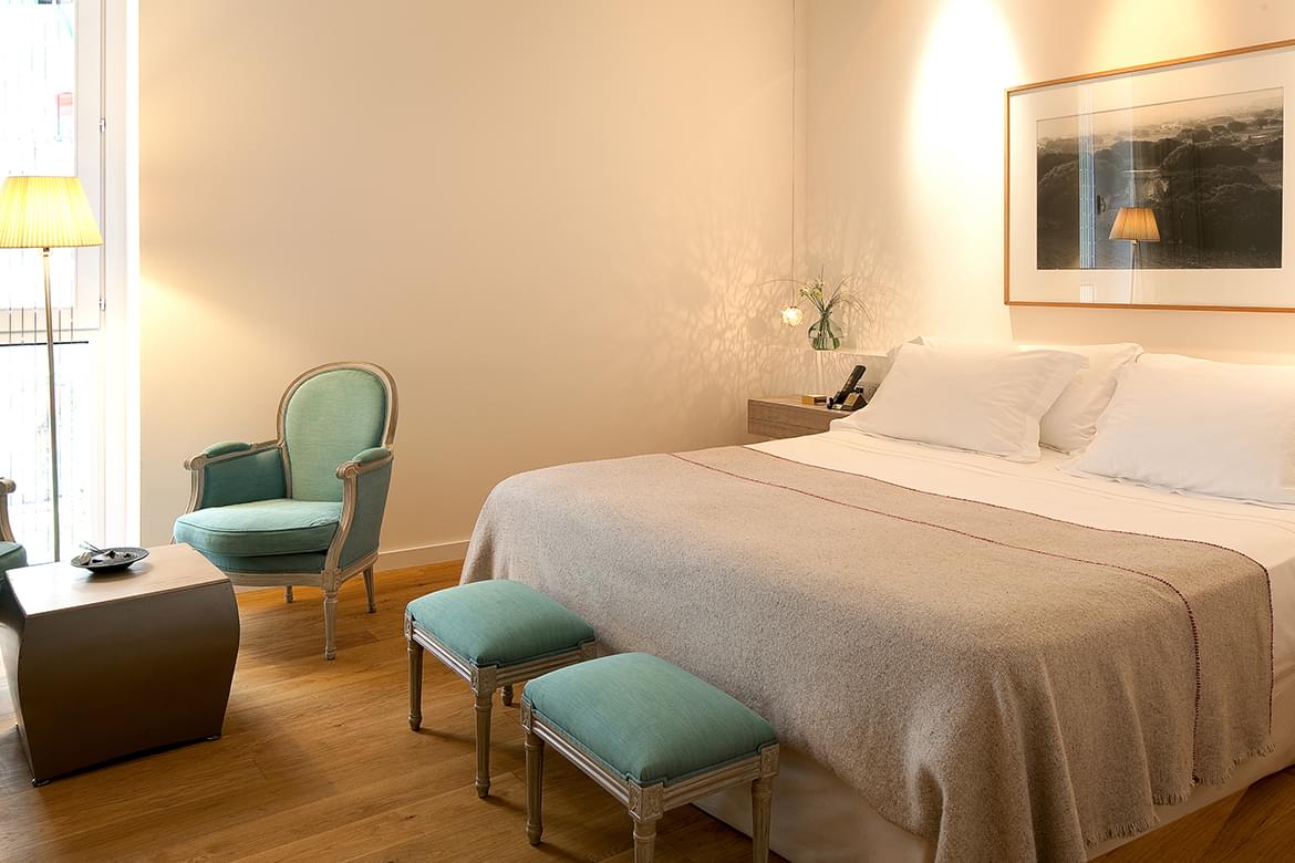 Separate living area in a room with extra space and comfort, decorated in neutral tones with views to the Gothic quarter streets. Wooden floors and delicate fabrics offer a welcoming and relaxing atmosphere. Natural stone bathrooms with bathtub and rain effect are intimate and peaceful.