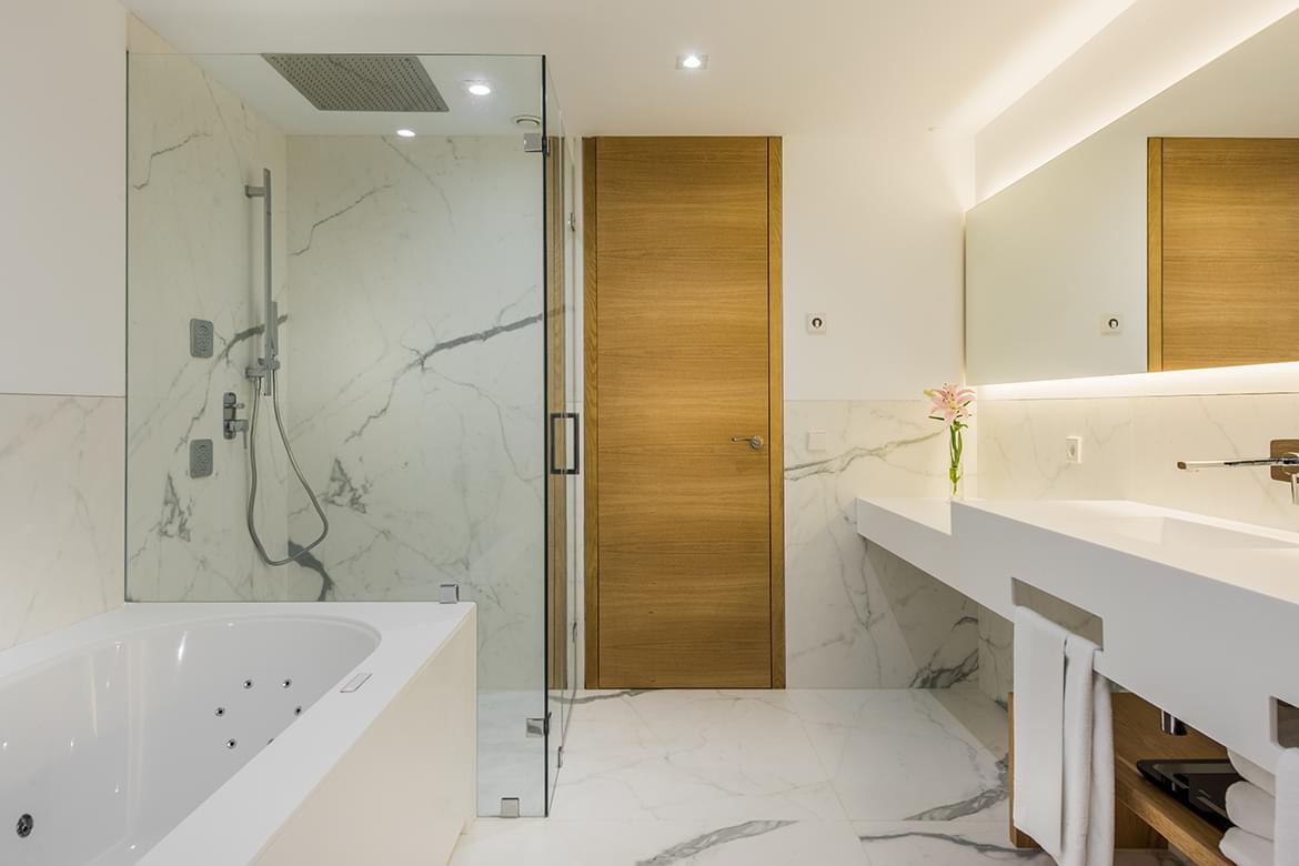 A private space to rewind, recharge and inspiration. The indoor space flows naturally to the outdoor private space overlooking the buzzling Plaza and the tropical gardens beyond. The open plan is a social space, the bathroom flows into the living space as the translucent glass walls do offer a sense of space. Comfortable in and outdoor seating create spaces to read, relax, and enjoy a drink or even an in-room Nobu dining experience.