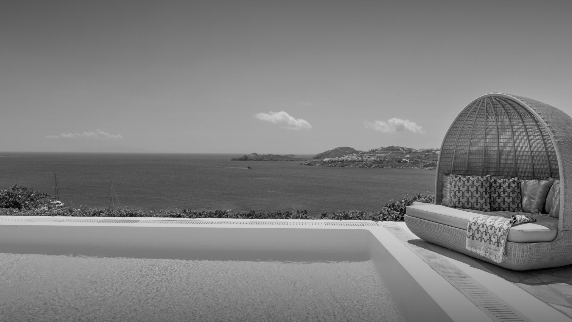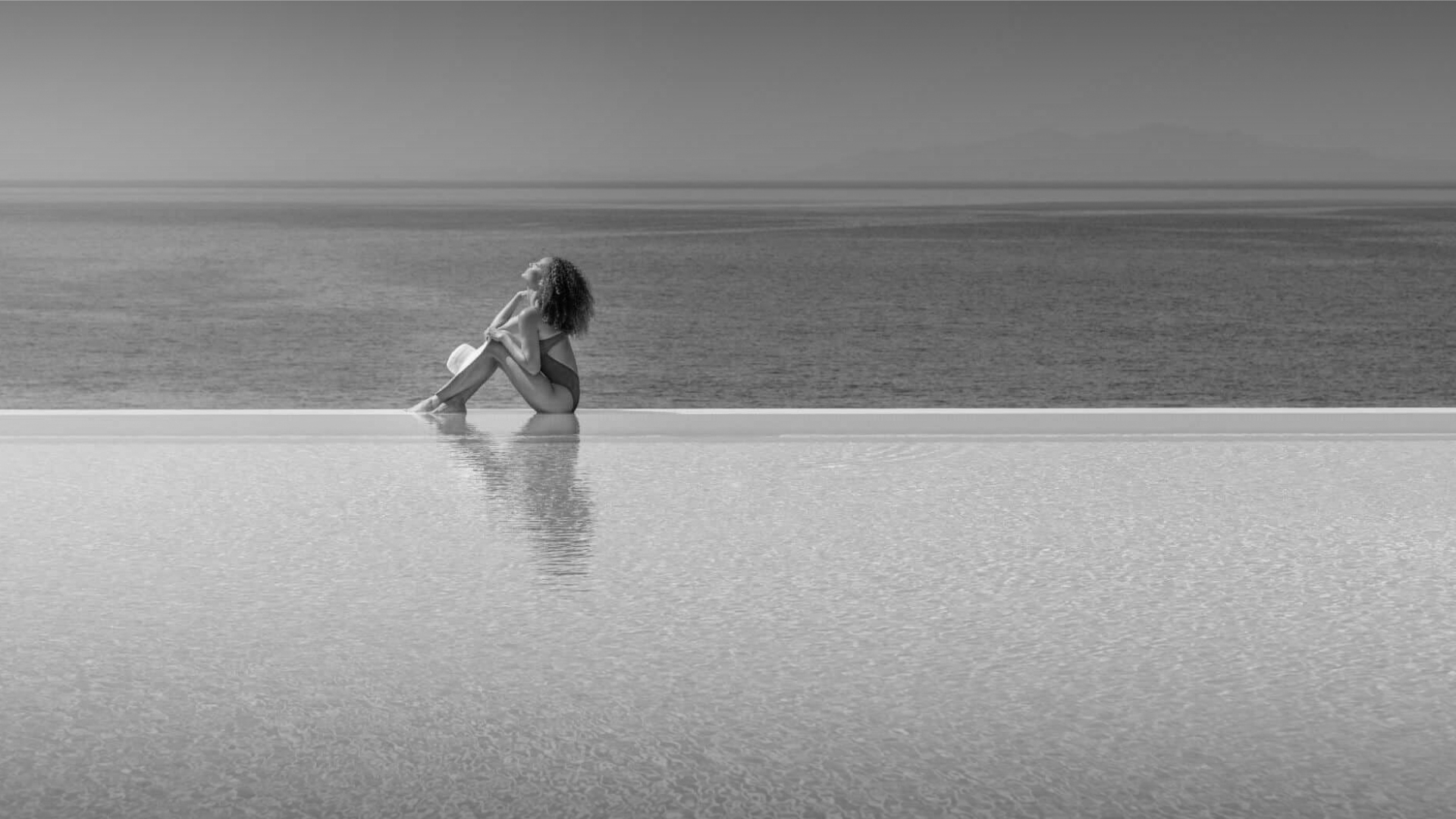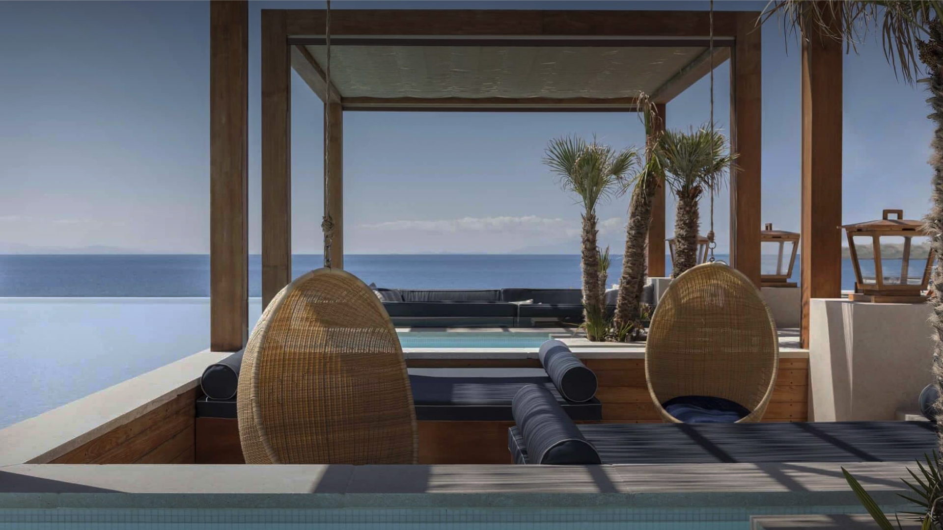 Santa MARINA overlooks the new and inviting infinity-edged pool, where expansive sunken lounge areas offer opportunities for relaxation and socialising. Furnished with comfortable sun loungers, hanging egg chairs and canopied sofas, the area provides an enriching space from which to luxuriate against the backdrop of the Aegean Sea.